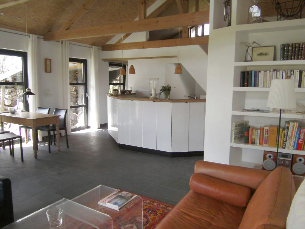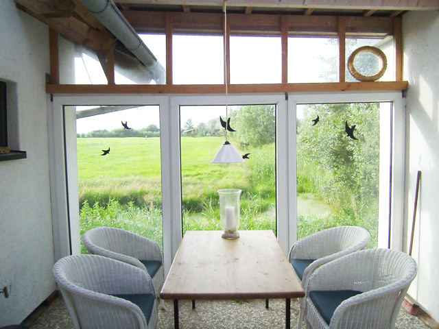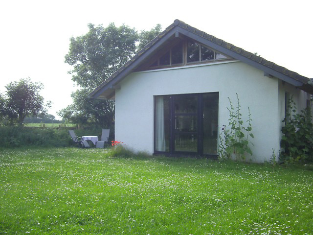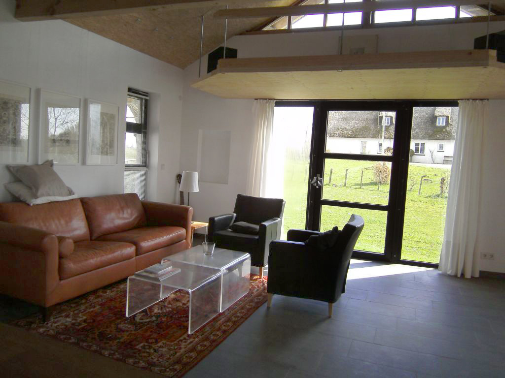 HUS OPN DIEK mit dem Atelier-Haus liegt in idyllischer Alleinlage am Rande des Nationalpark Wattenmeer inmitten von Wiesen und Feldern. Vom historischen Reethaus ist es 50m entfernt und von einer hohen Hecke umgeben. Es überzeugt durch eine offene, individuelle Architektur und unkonventionellen Grundriss. Vom großen, hohen Wohnraum mit sichtbaren Deckenbalken, Fußbodenheizung, Kaminofen und hochwertiger Ausstattung mit Designermöbeln tritt man direkt in den Wintergarten. Man blickt auf einen kleinen Teich und eine Wiese mit Kühen und Schafen. Die funktionelle, offene Küche ist im Raum integriert und durch einen Tresen nicht einsehbar. Fenster bis zum Boden erlauben einen Rundumblick in den Garten. Ein kleines ebenerdiges Schlafzimmer, ein modernes Bad und eine behagliche Schlafempore schließen sich an den Wohnraum an. Sie werden sich hier zu jeder Jahreszeit und bei jedem Wetter wohl fühlen – natürlich ist Ihr Hund willkommen.